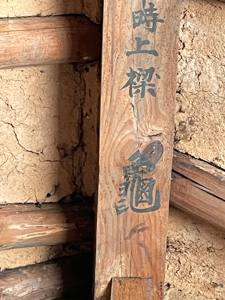 Carved at the top and bottom of the ridge beam inscription, the dragon and the turtle symbolize protection from fire and disaster.